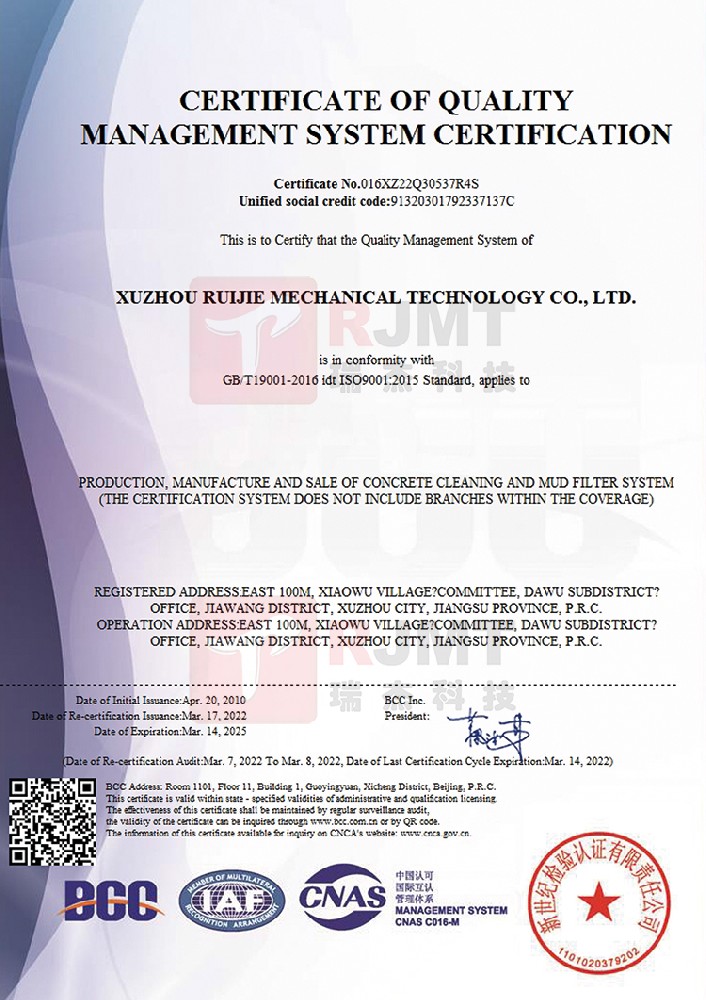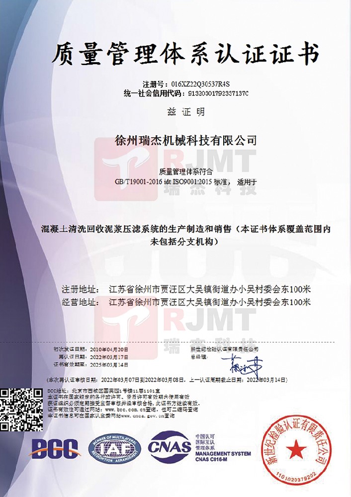 公司RJK系列混凝土清洗、污水回收以及泥漿壓濾系列產品在國內率先同時獲得ISO9001:2008國際質量管理體系認證(BCC)證書...+ MORE